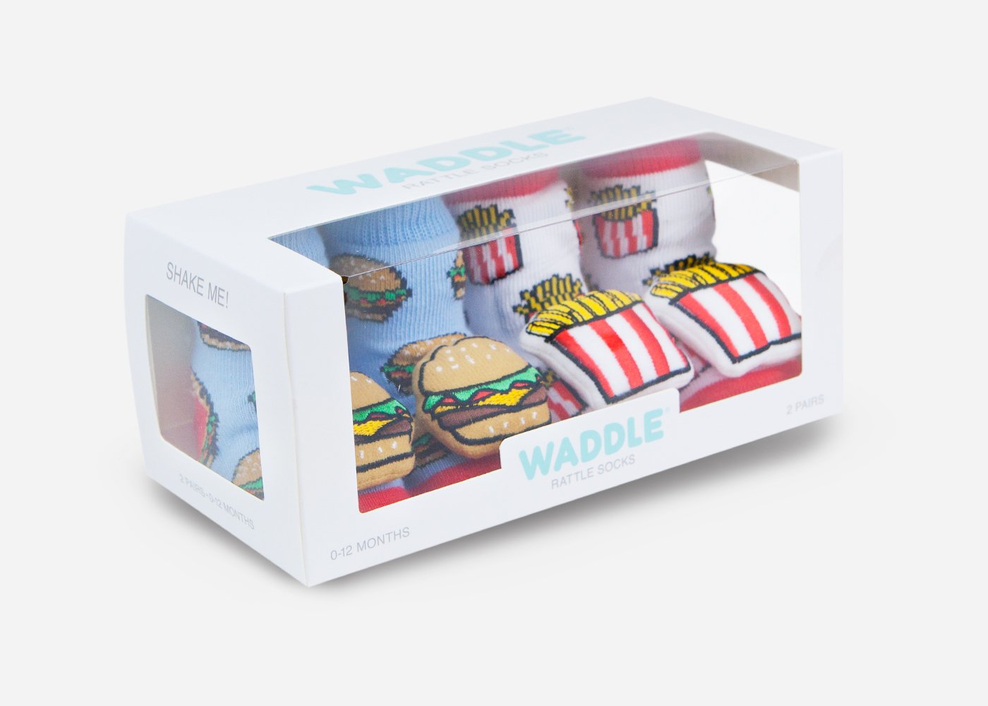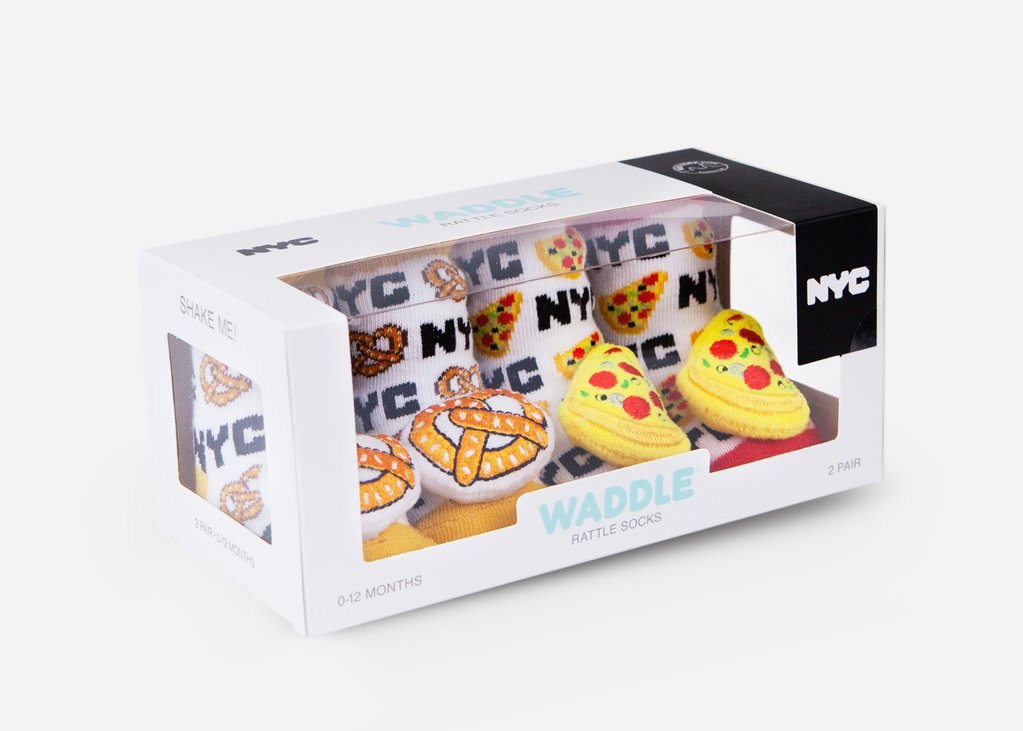 Shake up baby’s rattle routine with Waddle Rattle Socks. Each pair of comfy socks, which fit baby’s feet from birth to 12 months, has a rattle attachment on the front that is designed to aid in developing sensory skills through sound and touch.